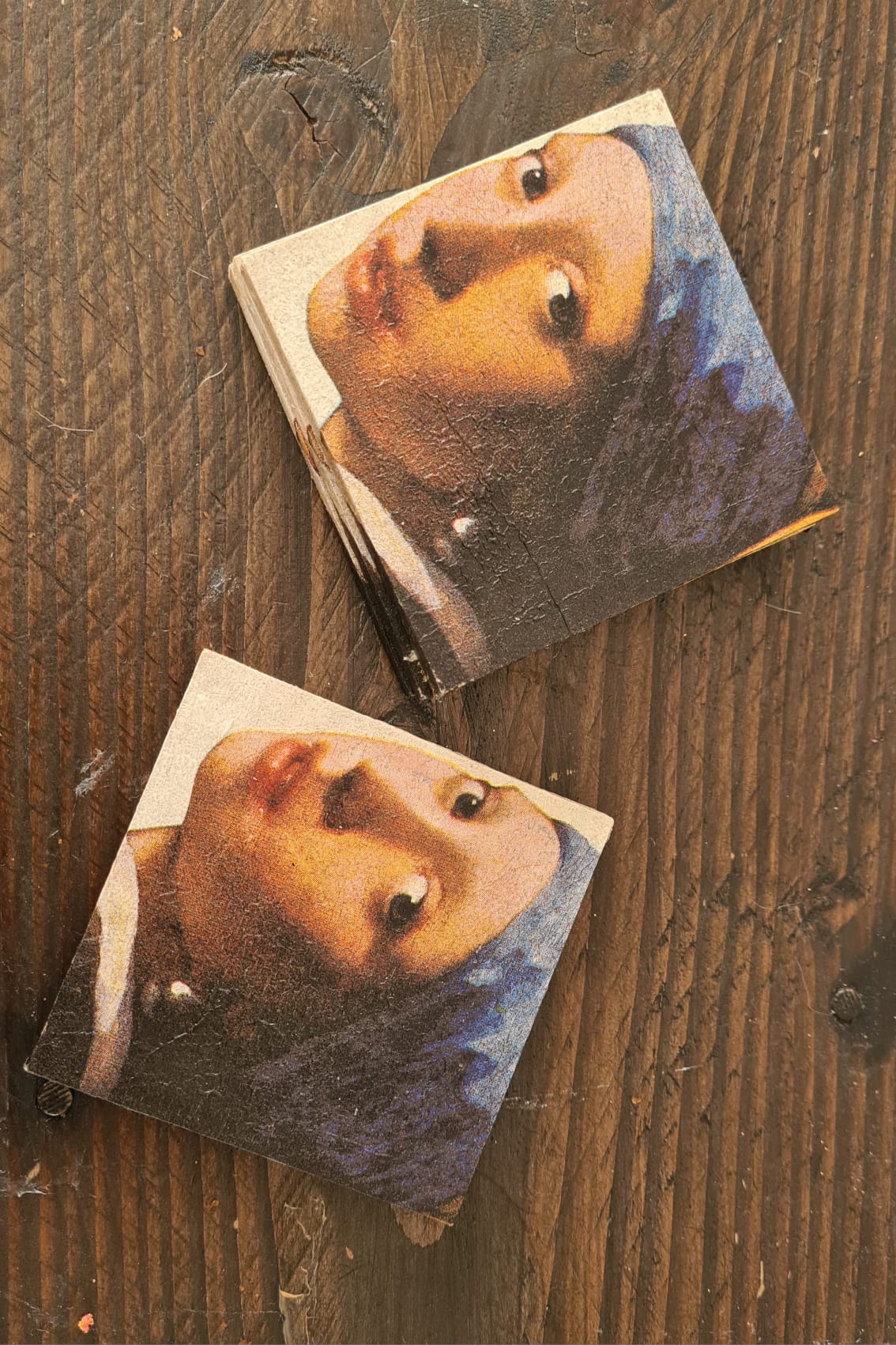 Deze unieke onderzetters zijn geïnspireerd op het iconische kunstwerk Meisje met de Parel en met zorg handgemaakt middels de decoupage-techniek. Door deze ambachtelijke werkwijze krijgt elke onderzetter een authentieke, licht vintage uitstraling en een artistiek karakter.