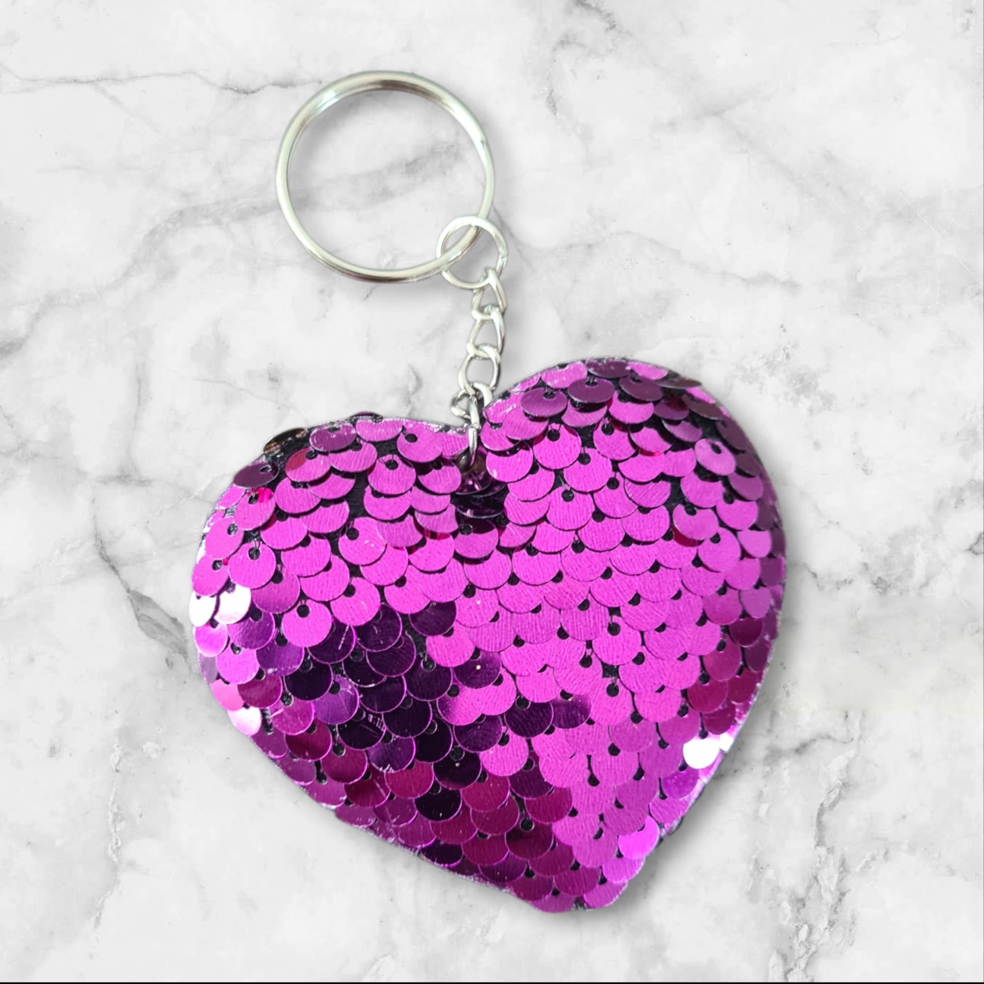 Deze hartvormige sleutelhanger met glanzende paarse pailletten is een echte blikvanger. Perfect om je sleutels, tas of rugzak een speelse en vrolijke uitstraling te geven.